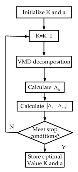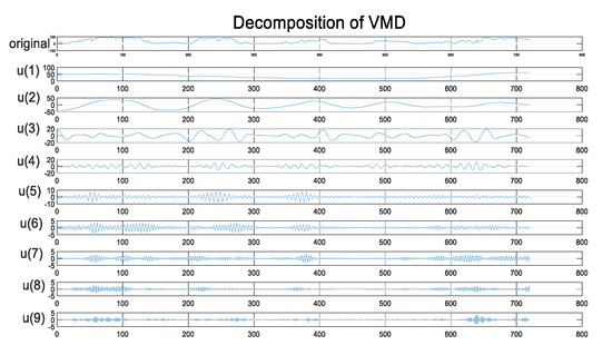 The number of decomposition mode number K is determined automatically by the method in Reference [30]. VMD decomposition is performed on the signal, and the correlation coefficient between the last modal component and the decomposition of the original signal is calculated. Firstly, suppose the modal number of VMD decomposition is k, and the correlation coefficient between the decomposition of the last modal component and the original signal is . Then, if the decomposition of the modal number is k + 1, the corresponding value is . When the difference between and is less than the threshold value a (a is set as 0.3% in this experiment), stop the decomposition. Otherwise, increase the value of k and keep decomposing until the stop condition is satisfied. Finally, record the final decomposition modal number k. The flow chart of VMD is as Figure 6: