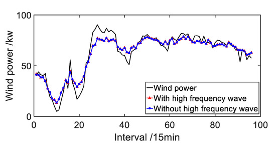 To further indicate the influence of high-frequency waves on prediction accuracy, wind power sequences with or without high-frequency waves were predicted by the VMD-improved GWO-ELM model, respectively. As can be seen from Figure 9, the fitting curve of wind power prediction with or without high-frequency waves is nearly the same.