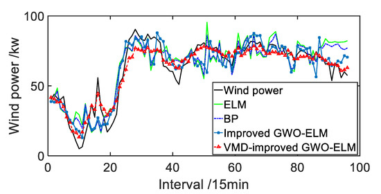 For better analyzing the prediction results, the prediction results of the ELM model, BP neural network model [31], improved GWO-ELM model, and VMD-improved GWO-ELM model were respectively compared.