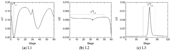 There are six controlled temperatures, as shown in Figure 4. There is one sensitive temperature (the 4th tray) in the prefractionator, two sensitive temperatures (the 33rd and 68th trays) in the middle section, and three sensitive temperatures (the 12th, 111th, and 173rd trays) in the main section. Therefore, the sensitive temperatures to be controlled are [TP,4, TMI,33, TMI,68, TMA,12, TMA,111, TMA,173]. According to the “pair close rule”, the manipulated variables should be close to the controlled variables. Therefore, L1 is adopted to regulate the sensitive temperature in the prefractionator; L2 and L3 are employed to regulate two sensitive temperatures in the middle section; D, S1, and S2 are selected to regulate three sensitive temperatures in the main section. For stabilizing control, at least one TC loop should be employed to separate one split of the distillation column [14]. As the complicated four-product extended Petlyuk DWDC inherently has highly nonlinear behaviors and excessive loop interactions, it is of significance to decrease the excessive interactions between the control loops with simpler control schemes. The prefractionator completes one sharp split and one temperature controller is needed. The middle section carries out two sharp splits and requires two temperature controllers. Three sharp splits are performed in the main section and three temperature controllers are required.