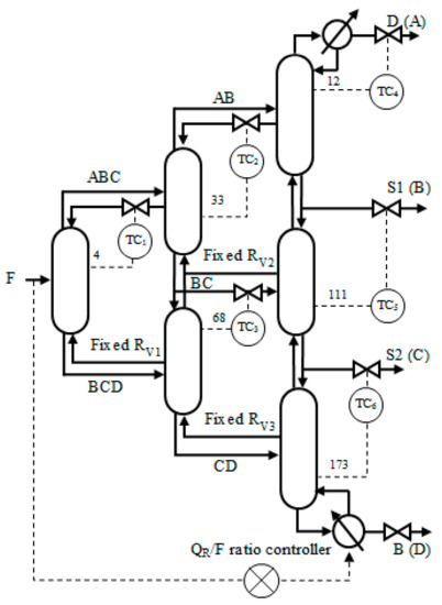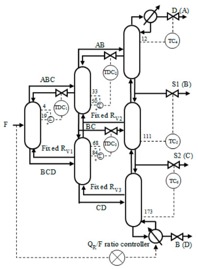 TC scheme contains four temperature controllers, as shown in Figure 7. For the controller TC1, the controlled variable is TP,4 and the manipulated variable is liquid reflux from MI to P (L1). The liquid reflux from MA to MI (L2) and the liquid reflux from MI to MA (L3) are adopted to control the 33rd and 68th tray temperatures in the middle section, respectively. D, S1, and S2 of the main section are employed to regulate the 12th tray, 111th tray, and 173rd tray temperatures, respectively.