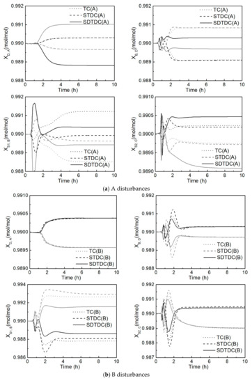 Dynamic performances using the STDC scheme are mostly superior to those adopting the TC scheme. For the top and bottom products, the performances of the STDC scheme are slightly better than the performances of the TC scheme in most cases. For the first and second side product streams, the performances of the STDC scheme are considerably better than the performances of the TC scheme, especially in face of feed flow rate disturbances. When ±10% flow rate disturbances occur, the STDC scheme is much better in maintaining the product purities and reducing the maximum deviations than the TC scheme. As for the settling time, the STDC scheme is also slightly superior to the TC scheme in most cases. The dynamic performances employing the SDTDC scheme are mostly superior to those adopting the TC scheme. For the top and bottom products, the performances employing the SDTDC scheme are slightly better than the performances adopting the TC scheme in most cases. For the first and second side product streams, the performances of the SDTDC scheme are much better than the performances of the TC scheme. In particular, the deviations employing the SDTDC scheme are mostly smaller compared with those employing the TC scheme.