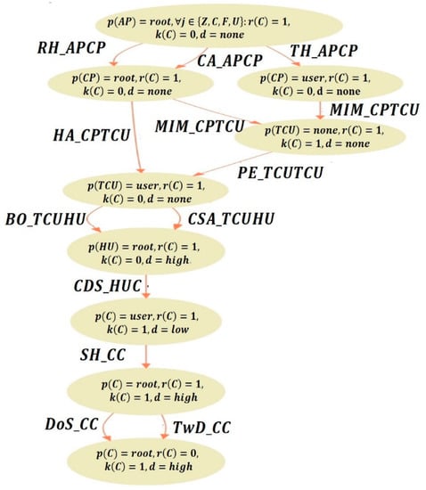 - Jia, F.; Hong, J.B.; Kim, D.S. Towards automated generation and visualization of hierarchical attack representation models. In Proceedings of the IEEE International Conference on Computer and Information Technology; Ubiquitous Computing and Communications; Dependable, Autonomic and Secure Computing; Pervasive Intelligence and Computing, Liverpool, UK, 26–28 October 2015; pp. 1689–1696. [Google Scholar]