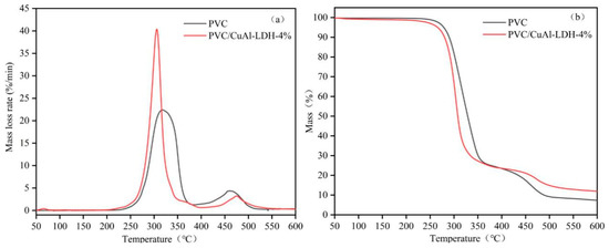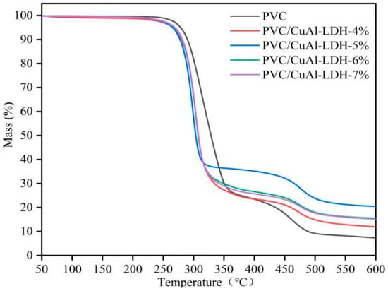 The pyrolysis process of PVC and its composites were investigated by TGA in the temperature range of 50 °C to 600 °C. The DTG and TG curves are presented in Figure 2a,b. The pyrolysis trend of PVC/CuAl-LDH-4% is similar to PVC, but they present with two different mass loss stages. The first region ranges from 50 °C to 400 °C, and the second ranges between 400 °C and 600 °C. The first stage is attributed to the dehydrochlorination of PVC and volatilization of the plasticizer, and the second is due to the further degradation of the molecular chains after dichlorination [29].