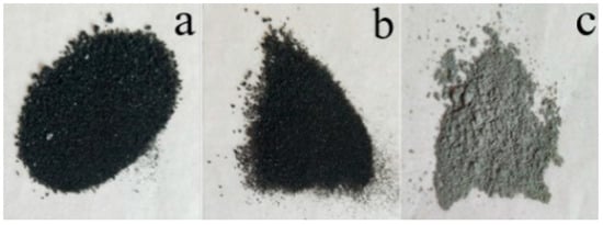 The carbonized product of PVC/CuAl-LDH-5% was achieved using a tubular furnace. The temperature of carbonization was 300 °C, the heating rate was 20 °C/min and the maintenance time of carbonization was 30 min. We examined this process under three atmospheres: nitrogen, vacuum and air. The morphology of the carbonized products are shown in Figure 4. The surface of Figure 4a,b shows black lustre before grinding which turns into dry and black solid particles after grinding. Thus, whether ground or not, Figure 4c shows a light gray powder all along. There is no doubt that the carbon element of PVC/CuAl-LDH-5% would combine with oxygen in the air to form carbon dioxide, which would be released quickly. The carbon content of the product decreases sharply, so the morphology of the carbonized product is hardly seen. Moreover, at the end of pyrolysis, these products have a light green powder appearance due to the presence of copper ions.