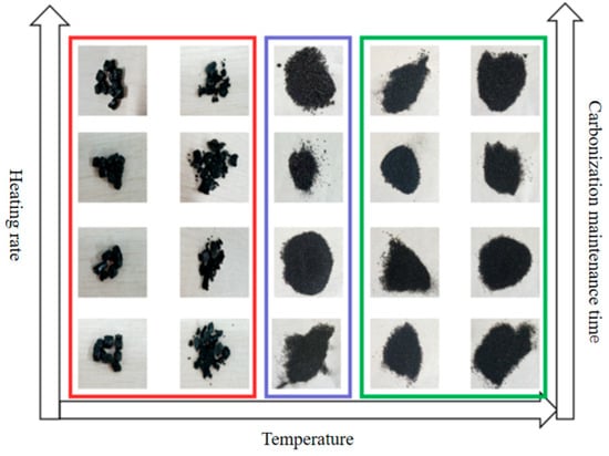 The carbonied product of PVC/CuAl-LDH-5% was obtained using a tubular furnace with different pyrolysis conditions in a vacuum. The vacuum was set at 0.08 MPa, and the carbonization temperature, heating rate and carbonization maintenance time ranged from 250 °C to 600 °C, 10–40 °C/min and 10–120 min respectively. The morphology of the carbonized product is shown in Figure 6.