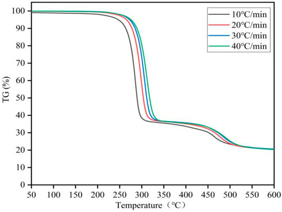 PVC/CuAl-LDH-5% was investigated by TG at different heating rates in the temperature range between 50–600 °C under nitrogen atmosphere. The TG curve is presented in Figure 8. It can be seen that the pyrolysis trend of PVC/CuAl-LDH-5% at different heating rates are similar to each other. At the termination pyrolysis temperature, the yield of the PVC/CuAl-LDH-5% carbonized product is virtually identical at all different heating rates. These results suggested that the yield of the carbonized product is unaffected by heating rate in TG.