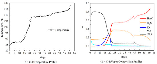 Under steady-state, the temperature distribution of the tray and the composition distribution of the gas and liquid phases in the HAc dehydration column C-1 and the azeotrope recovery column C-3 are shown in Figure 2. From the top of the tower to the 14th tray and from the 25th tray to the tower kettle, the temperature changes were relatively stable, showing a slight upward trend. Between the 15th and 20th stage trays, the temperature variation range was large. At the same time, the HAc content increased sharply from 0% to 75% from the 13th plate to the 24th plate. The concentration of the HAc and water at the bottom and the top of the column was less than 0.1% and the bottom water content of the column was less than 7%. The temperature of the C-3 column varied greatly between the 11th and the 20th trays. In addition, the distribution of components in the azeotrope recovery column changed noticeably. In this interval, the MA content dropped sharply to 0, the water content rose sharply to 1, and the azeotropic agent NPA gradually increased from 0 to the maximum value on the 15th and 16th plates, followed by a gradual decrease to 0. The contents of the HAc and PX in this column were small, close to 0, and could be ignored. There was hardly any NPA entrainer at the top and bottom of the column, and all the entrainer only produced in the middle side-draw, which indicated that the entrainer recovered well.