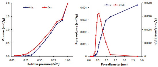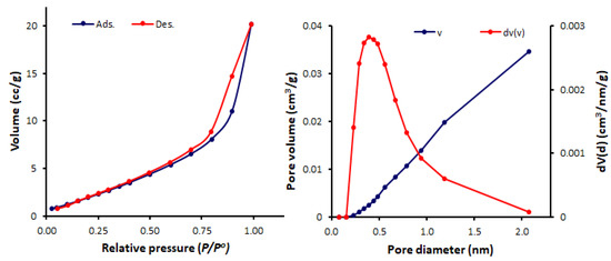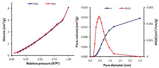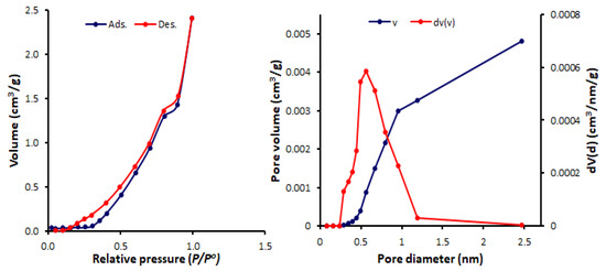 The N2 adsorption–desorption measurements for the Schiff bases 1–4 were conducted at 77 K. The N2 isotherms and pore sizes and volumes of Schiff bases 1–4 are represented in Figure 6, Figure 7, Figure 8 and Figure 9. The shape of the N2 isotherm for 1 was similar to the type IV isotherm. Schiff bases 2–4 showed N2 sorption isotherms that are almost identical to the type III isotherm, in which monolayer formation was not identified.