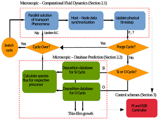Figure 1, the blue region describes the parallel computation of the macroscopic gas-phase CFD model, the green region describes the surface deposition model, and the yellow components and arrows describe the logical connection and the direction of workflow. At the beginning of every time step,