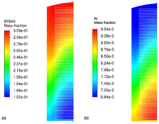 Figure 3a, which was chosen at a random process time for illustration purposes. The downward transport in the vertical region besides the wafers was a combination of diffusion and convection, as indicated by an asymmetric velocity magnitude of 0.05 m/s, which is equivalent to a vertical velocity magnitude of 0.008 m/s. In the inter-wafer region, the species transport was diffusion-only in the radial direction because the velocity was approaching zero. In addition, under a rotary vacuum pump setting of 12 M