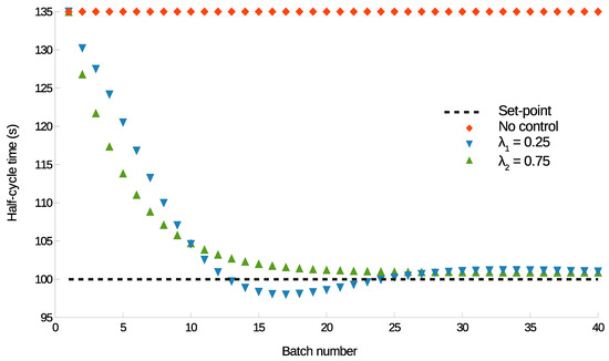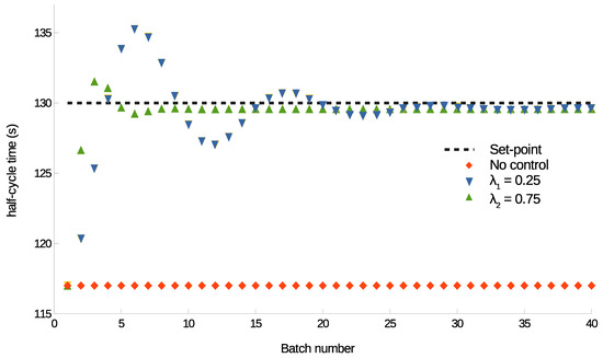 , the half-cycle time first reaches the set-point at about 25 and 12 batches, respectively.