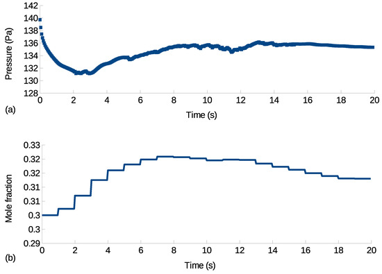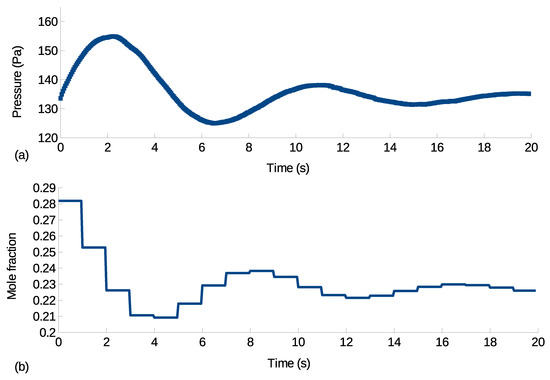 Figure 9. The operating pressure considered here is again a vacuum pump disturbance, which drives the equivalent operating pressure to be 100 Pa. Triggered by the gas sensor measurable variation, which is selected to be a difference of 2% in partial pressure per time step from the steady-state value, the PI controller applies real-time feedback control. As shown in
