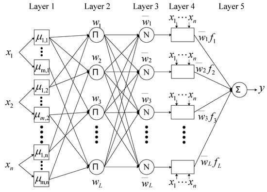 The ANFIS configuration used in this paper is shown in Figure 5, which is a five-level network structure where each node has similar function. Oh,k denotes the output of the k-th rule in the k-th layer, xi represents input variable, uji represents fuzzy set, wk represents rule layer output, represents the output of the normalized rule layer, fk represents a one-order Sugeno equation, and y represents the sum of the inference results.