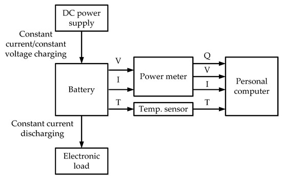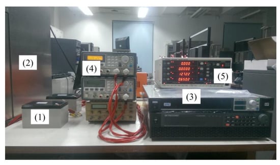 Due to the fact that the lead-acid battery has a relatively wide operating temperature range, and the effect of current and temperature on its capacity is more observable, it is a good target for analyzing experimental results and testing the effectiveness of SOC estimation algorithms. In the experiment, the battery was charged by a DC power supply in a two-stage manner and discharged using an electronic load with a constant current mode. Figure 6 shows block diagram of the experimental system. In Figure 7, we can see that the experimental hardware included (1) a single lead-acid battery (REC14-12), (2) a temperature and humidity controlling chamber (THCC), (3) a power supply, (4) an electronic load, and (5) a power meter.