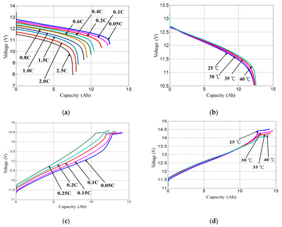 Experimental results of capacity measurement at: (a) various discharging currents at 25 °C; (b) 0.1C discharging current with various temperatures; (c) various charging currents at 25 °C; (d) 0.1C charging current with various temperatures.
