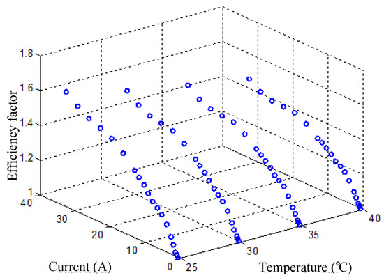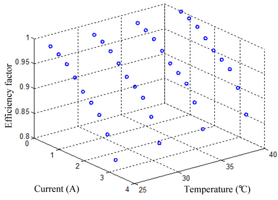 After obtaining characteristic parameters of the battery, the training tasks for ANFIS can be performed. First, the measured characteristic parameters were divided into training data and testing data. When selecting training data, the boundaries must contain the range of all possible applications; otherwise, performance of the algorithm beyond training range will result in erroneous output. In addition, the amount of training data will affect learning speed of the algorithm. If the amount of training data is too large, it will take a lot of time and occupy a large amount of computer memory and even stop the algorithm from being out of memory range. In order to explore the impact of the amount of training data on the algorithm, two sets of training data with different sampling intervals were used. The dataset with more training data was defined as set A, and the dataset with less training data was defined as set B. Table 6 summarizes the amount of data used in training and testing stages. Figure 9 and Figure 10 show two of the training results, respectively. Parameters required for efficiency adjusting factor estimation were current and temperature. Experimental data obtained by performing constant–current charging and discharging tests on the battery with ten discharging currents and five charging currents at four temperatures were used as training data. Training data are graphically shown in Figure 11 and Figure 12.
