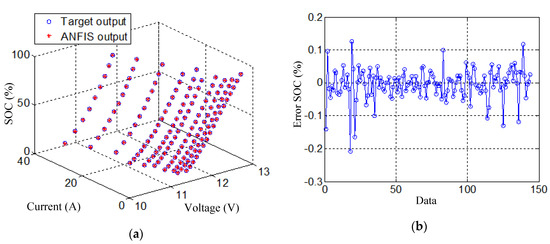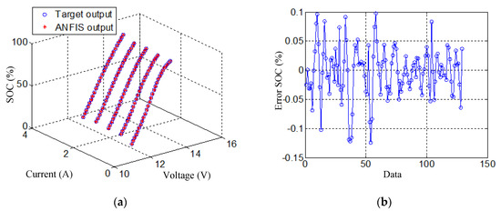 Table 7 summarizes the charging training results. Due to the fact that there are too many test data, only the best results at 25 °C in Table 7 were selected for analysis, which is the result of membership function combination 4, 4, 3, 2 and the root mean square error (RMSE) of 0.0862, as shown in Figure 13. Table 8 summarizes the discharging training results. The best test results at 25 °C in Table 8 were selected for analysis, which were the result of membership function combination 6, 5, 4, 1 and the RMSE of 0.0615, as shown in Figure 14.