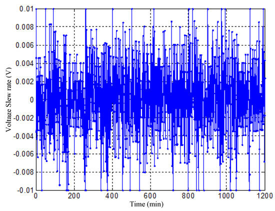 As can be seen in the charge and discharge curves of a battery shown in Figure 2, both sides of the SOC-V curves exhibit nonlinear characteristics and are referred to as the exponential zones, while the middle section is called the linear zone, which is usually defined as 10–95% of battery’s SOC. Due to that fact, the battery voltage changes quite rapidly in the exponential zones but relatively slowly in the linear zone. As a result, the section where the SOC is located can be judged by voltage slew rate within a sampling interval, and the sensitivity of SOC to battery voltage can be further improved according to this information. Voltage slew rate (ΔV) in this paper is defined as follows: