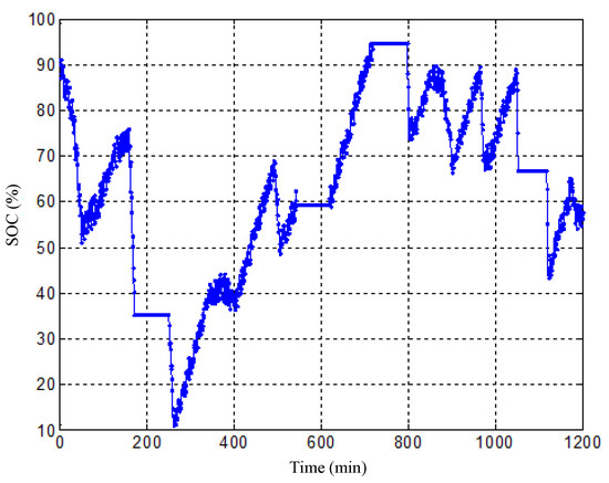 In case 2, the discharging voltage was measured between 10.1 V and 12.7 V per single cell, and discharging current amplitude was the same as that of the charging current in case 1. The measurement was performed at 11.5 V and 11.9 V, respectively. Figure 25 shows the estimated SOC by ANFIS algorithm. Figure 26 shows the AC active power responding to the discharging operation.