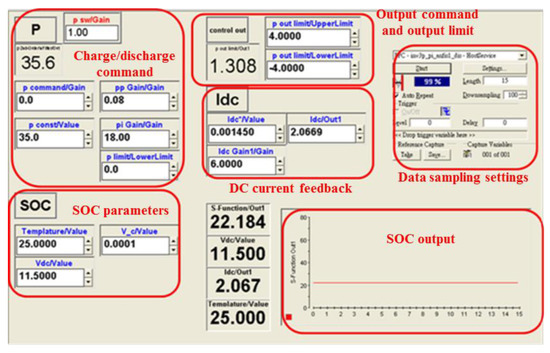 To further test the feasibility of the proposed algorithm, an inverter integrated BESS hardware setup was implemented with dSPACE real-time digital control interface. The DS1104 and dSPACE Real-Time Interface (RTI) interface are used to efficiently perform the arranged charging/discharging cases. RTI is a MATLAB/Simulink graphical interface tool provided by dSPACE, and it makes practical verification of control strategies using dSPACE1104 quite efficient. In addition, its ControlDesk can be used for data measurement, monitoring, and recording. Figure 20 shows a typical ControlDesk interface designed for the hardware implementation of the proposed hybrid real-time SOC estimator.