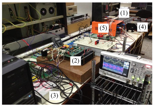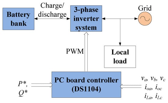 The block diagram of a grid-connected three-phase inverter system with a battery bank is shown in Figure 21, and a photo of the hardware implementation is shown in Figure 22, including (1) battery bank, (2) three-phase inverter, (3) controller (DS1104), (4) local load, and (5) power grid. The control command of the three-phase inverter is equivalent to the charging/discharging power, and the feedback signals include system voltage, inverter output current, and load current. In this experiment, nine identical lead-acid batteries with rated capacities of 14 Ah and voltages of 12 V were connected in series at the DC side of the inverter as the battery bank. The bidirectional three-phase inverter charges/discharges the batteries by adjusting active power command. When discharging, because part of the power is consumed by the local load, a larger AC power command is required to achieve active power feeding to the grid. When charging, because only the power absorbed by the battery bank is considered, the AC power required for charging is close to DC power. With the analog-to-digital (ADC) processing, DS1104 feeds actual line voltage and line current signals back to the computer for the related power calculations.