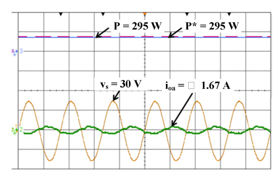 In case 1, charging voltage range was measured between 11.7 V and 14.2 V per single cell, and charging current was 3 A. Measurement was performed at 12.3 V and 13.7 V, respectively. Figure 23 shows SOC estimated by ANFIS algorithm. Less than 2% error was observed, validating the precision of the proposed algorithm. Figure 24 shows the AC active power response during charging operation, including charging power command P* and actual charging power output P, where vs represents system voltage and io represents inverter output line current.