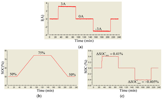 Measured results in case 3: (a) battery current; (b) variations in battery SOC; (c) ΔSOC.