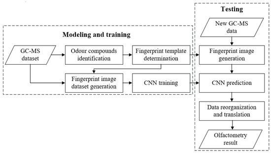 Then using machine-learning methods, data characteristics stored in fingerprint images are extracted for olfactometry results prediction. CNN is applied here as a regression model and the prediction results can be obtained by data reorganization and translation. The process of the whole model is displayed in Figure 1.