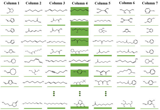 A total of seven columns were extracted as shown in the fingerprint template (Figure 2). Column 4 in the middle contained the key odor compounds. Columns 3 and 5 collected carboxylic acids, esters and other compounds that might be a major influence on human sniffing. Columns 2 and 6 selected ketones, aldehydes, alcohols, and other compounds which might make a subordinate contribution to the olfactometry results. Columns 1 and 7 included cyclic compounds, which were released in a low frequency and might prevent correct perceptions the key compounds [18].