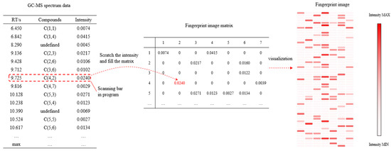 Secondly, a fingerprint image generation process is introduced to convert the instrument spectrum into structured data. For each sample, the GC spectrum intensity could be filled in the corresponding substance blank in the fingerprint template and the matrix for each sample is unique like DNA. Therefore, the obtained matrix displayed by color scale could be considered as a fingerprint image for a specific sample.