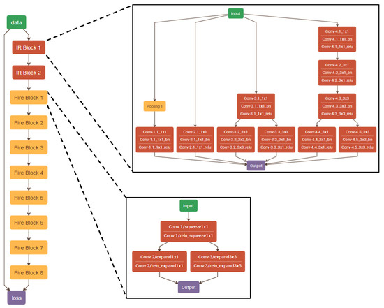 A novel hybrid machine learning model based on CNN was proposed by mixing the structure of GoogLeNet and SqueezeNet [19], as is displayed in Figure 4. This model combined the generalization ability of GoogLeNet and the light-weight design of SqueezeNet, and would undertake feature extraction from the fingerprint then identify the features to make a prediction. IR Blocks represented the GoogLeNet convolution modules, and Fire Blocks represented the SqueezeNet Fire Modules. The specially designed IR Blocks using six convolution kernels of different sizes provide multiple ways to perceive images. The output of the IR blocks concatenated the features extracted by different convolution ways. The Fire Blocks applied 1 × 1 sized kernels to reduce the dimension of the IR blocks output and add more ReLU functions for nonlinear activation of the network. Additionally, the 3 × 3 sized kernels in the Fire Blocks maintained the feature extraction of the network. A total of two IR Blocks and eight Fire Blocks were added into the CNN structure. To reduce overfitting problem, batch normalization [20] and L2 regulation [21] were added in blocks. The detailed convolution operations in these blocks are also introduced in Figure 4.