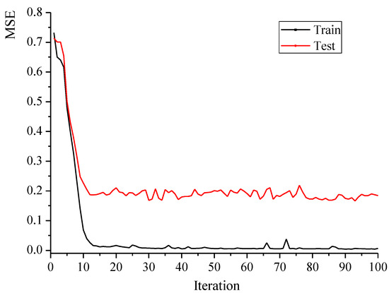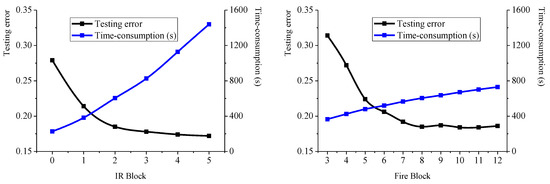 For laboratory use, a structure with an acceptable margin of error and less training time should be selected. Evaluation results in Figure 6 illustrated that two IR Blocks was adequate for feature extraction, because the testing error did not have a sharp decline but the time-consumption for each IR Block was large when the number of blocks reached two. Additionally, eight Fire Blocks was adequate for prediction, because the testing errors levelled off when the number of blocks reached eight. The evolving trend of testing error and the choice of CNN structure can be explained by substructure (blocks) characteristics of the network. IR Blocks based on GoogLenet are designed with excellent generalization performance resulting from its sparse structure and multiple convolution patterns. There are six convolution patterns in a designed IR block, and some patterns consist of multistep convolution. Thus, only a few of these substructures can guarantee the generalization performance and accuracy of the model. Fire Blocks based on Squeezenet are light-weight substructures to obtain regression results with lower-overfitting. Simple convolution patterns make it unfeasible to accomplish the regression task in a limited quantity of substructures, but adding a substructure does not increase the time-consumption too much. Then, eight blocks are added into the CNN structure and a model with acceptable accuracy and time-consumption is obtained.