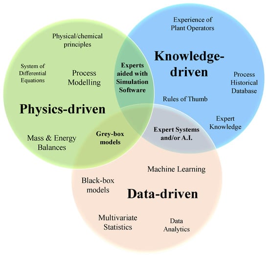 In general, process monitoring can be performed using either a physics-driven, knowledge-driven, or data-driven approach (see Figure 1) [,]. Among these, the data-driven approach may be preferred due to the following reasons. Physics-driven methods rely on a first-principles model of the system, i.e., mass-and-energy balances and physical/chemical principles, which is used to check how well the theory agrees with the observed plant data. However, these models are difficult to construct given the complexity of modern industrial plants []. Similarly, knowledge-driven methods rely on expert knowledge and the experience of plant operators to judge process conditions, but a comprehensive knowledge base may be too time-consuming to accumulate and codify precisely []. In contrast, data-driven methods rely only on plant data from which statistical models can be built to classify normal from faulty conditions. Nowadays, plant data sets are generated in abundance []. Samples are collected from online sensors on hundreds to thousands of process variables every few seconds [] via Supervisory Control and Data Acquisition (SCADA) systems. Many researchers have long recognized the opportunity to exploit these data sets for process monitoring, and this led to the development of Multivariate Statistical Process Monitoring (MSPM) methods. Data-driven methods and MSPM provide the context to this review paper. However, in the larger context, process monitoring researchers must still aim for the right synergy between physics-, knowledge-, and data-driven technologies.