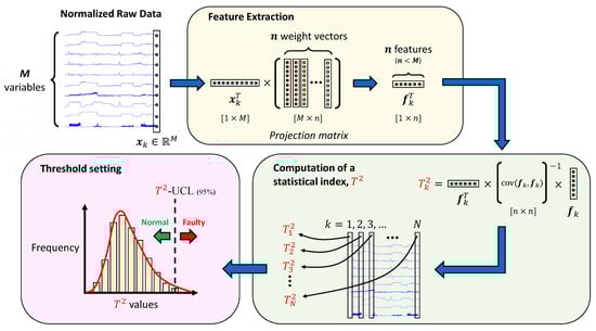 Basic steps of typical Multivariate Statistical Process Monitoring (MSPM) methods to achieve fault detection. Here, the feature extraction step shows only a linear transformation of data.