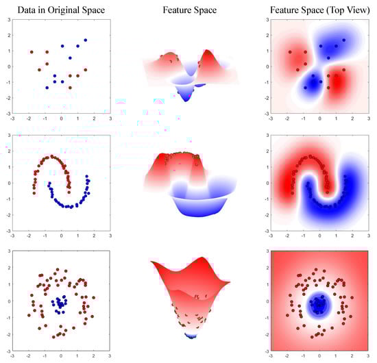 To understand what happens in the kernel mapping, Figure 3 shows three sample data sets and their projections in the kernel feature space. The red and blue data points belong to different classes, and evidently, it is impossible to separate them by a straight line in the original data space. However, after a kernel transformation onto a higher dimensional space, it is now possible to separate them using a linear plane (white contour), which translates to a nonlinear boundary in the original space. In these examples, an RBF kernel of various c values was used, Equation (5), and the transformation is computed using Support Vector Machines (SVM). More theoretical details on kernel methods, KPCA, and SVM can be found in other articles [,,], as well as books such as Kernel Methods for Pattern Analysis by Shawe-Taylor and Cristianini [], Support Vector Machines and Other Kernel-based Learning Methods by Cristianini and Shawe-Taylor [], and Pattern Recognition and Machine Learning by Bishop [].