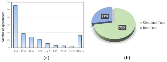 In the reviewed papers, application case studies were also used for evaluating the effectiveness of the proposed kernel methods for process monitoring. Figure 6b shows the breakdown of papers according to the type of case study they used: simulated or real-world. As shown, only 27% of the papers have indicated the use of at least one real-world data set, taken from either industrial processes or laboratory experiments. On the other hand, the rest of the papers used simulated data sets alone for testing. The Tennessee Eastman Plant (TEP) is found to be the most commonly used simulated case study. It may still be advantageous to use simulated case studies since the characteristics of the simulated data are usually known or can be built in the simulator. Hence, the user can highlight the strengths of a particular method by its ability to handle certain data characteristics. Another advantage of using simulated data is that tests can be repeated many times by performing many Monte Carlo simulations. Nevertheless, the ultimate goal should still be to assess the proposed methods on real-world data. For instance, in a paper by Fu et al. [], kernel PCA and kernel PLS were applied to 3 different real-world data sets: two from the chemical process industry and one from a laboratory mixing experiment. Among the chemical processes is a butane distillation system. Vitale et al. [] also used real-world data sets from the pharmaceutical industry to test kernel methods. Results from these examples have proven that handling the nonlinear issue is important for monitoring real-world industrial processes.
