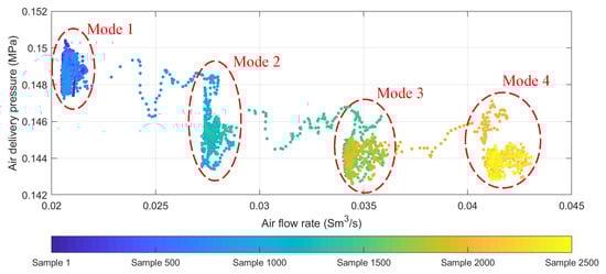 Multi-modality is a related issue found in processes that are designed to work at multiple operating points []. Figure 7 shows an example of a data set taken from the multiphase flow facility at Cranfield University [], which exhibits multi-modality on the air flow measurements. The challenge is having to distinguish if transitions in the data are due to a change in operating mode or due to a fault. If this issue is not addressed, the changes in operating mode will trigger false alarms []. To address this issue, Yu [] used k-nearest neighbors to classify the data prior to performing localized kernel FDA for batch process monitoring. Meanwhile, Khediri et al. [] used kernel K-means clustering to identify the modes, and then support vector data description (SVDD) to detect faults in each cluster. Other ways to identify modes include a kernel Gaussian mixture model [], hierarchical clustering [,], and kernel fuzzy C-means [,]. More recently, Tan et al. [,] proposed a new kernel design, called non-stationary discrete convolution kernel (NSDC), for multi-mode monitoring (see Section 4.7). The NSDC kernel was found to yield better detection performance than the RBF kernel based on the multiphase flow facility data [].
