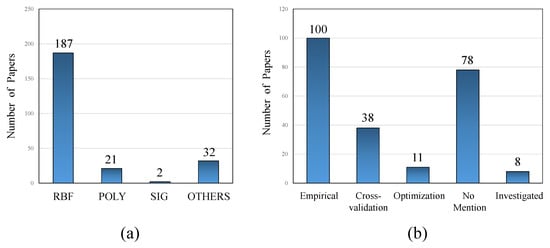 where is a column weight vector, are the features, is the new data to be projected, is the training data set, and is the kernel function. The kernel function is responsible for projecting the data onto high-dimensional spaces where, according to Cover’s theorem [], the features are more likely to be linearly separable. This high-dimensional space is known in functional analysis as a Reproducing Kernel Hilbert Space (RKHS) []. Usual choices of kernel functions found from this review are as follows:
