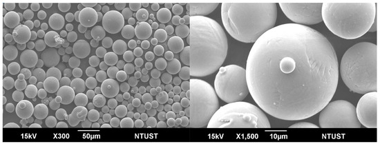 Cellular titanium alloys are promising biomaterials for achieving bone-mimicking. AM techniques, for example, SLM are able to fabricate cellular titanium alloy structures with the accurate design of micro-architecture [39]. In addition, titanium alloys are highly degradable, corrosion-resistant, high-strength, low-density material and this material has a wide-ranging use in biomedical industry [40,41,42]. Mainly, the Ti6Al4V powder was used in several studies due to its excellent biocompatibility. Therefore, due to the above reasons, titanium alloy powder was chosen in this study. The Ti-6Al-4V powder was bought from the electro-optical system (EOS) GmbH, Germany. Figure 1 shows the SEM micrograph original titanium alloy powder at different magnifications and the chemical composition of Ti-6Al-4V is listed in Table 1.