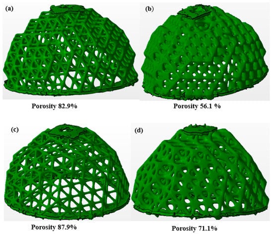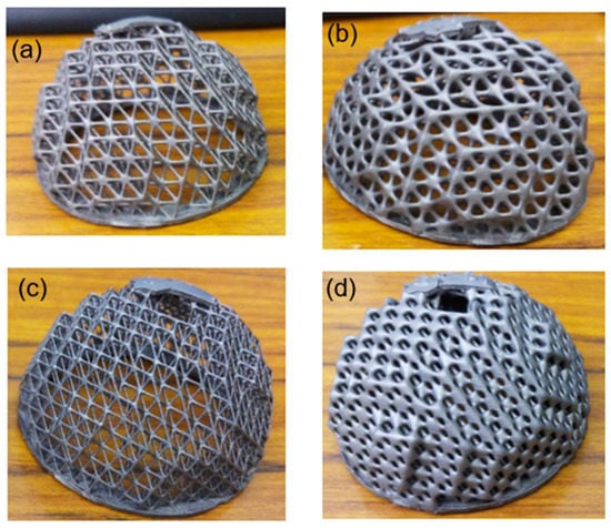 The acetabular cup implant with vintiles lattice structures with different porosity (optimized and non-optimized) and unit cell sizes 5 and 6 mm were manufactured using the SLM process with no obvious deformations. The models of the AC implant with vintiles lattice topology structures and having different unit cell sizes are shown in Figure 7.