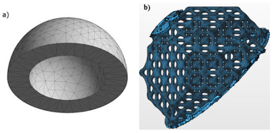 Meshing on an AC implant model for FEA, (a) solid and (b) cellular implant.