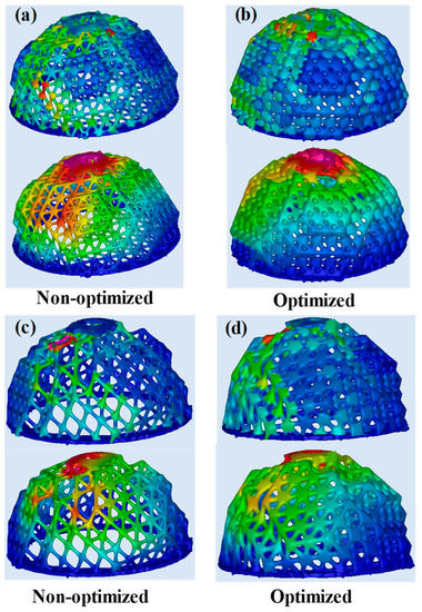 Results of FEA (a) unit cell size 5 × 5 × 5 mm non-optimized, (b) 5 × 5 × 5 mm optimized, (c) 6 × 6 × 6 mm non-optimized, and (d) 6 × 6 × 6 mm optimized.