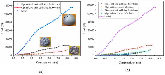Compressive load-compression curves. (a) Solid with optimized, (b) all solid, optimized, and optimized.