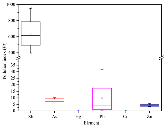 where is the single factor pollution index of element i, is the ith metal concentration in the sample, is the background value of the target element, and is the toxic response factor for each of the six metals: Sb (19), As (10), Hg (40), Pb (5), Cd (30) and Zn (1) [32,33]. is the single factor potential risk factor. According to , the sediments or soils were categorized into five levels: (1) ≤ 40, low risk; (2) 40 < ≤ 80, moderate risk; (3) 80 < ≤ 160, moderate to high risk; (4) 160 < ≤ 320, high risk; (5) > 320, very high risk. RI is Multi-factor and comprehensive potential ecological hazard index. According to RI, the sediments or soil were categorized into four levels: (1) RI ≤ 150, low risk; (2) 150 < RI ≤ 300, moderate risk; (3) 300 < RI ≤ 600, high risk; (4) RI > 600, very high risk.