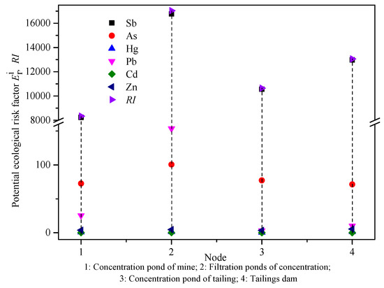 In light of Technical Guidelines for Environmental Impact Assessment Surface Water Environment (HJ/T 2.3-1993) and related literature [34,35] the significance of pollution by As, Hg, Pb, Cd, and Zn was referenced against Quantitative IV water quality standard in Surface Water Environmental Quality Standards (GB3838-2002) as the reference value for ecological risk assessment [27], and for Sb, a value of 0.005 mg·L−1 was used as the reference value [28].