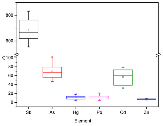 At present, there is no unified evaluation standard for PTEs pollution in dust at home or abroad, and the reference values are quite different [36]. Some scholars select typical reference points to evaluate PTEs’ content according to the evaluation objects [37], but most scholars use local soil background values as reference [38,39,40]. Hunan is a calcareous lithosol region, and the background value of Sb, Pb, Zn, and other elements in soil and the ore itself is relatively high. Therefore, the background content of soil in Hunan Province was selected as the standard reference.
