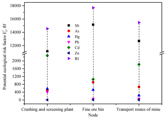The Eir of each PTE (Sb, As, Hg, Pb, Cd, Zn) in the dust and the potential ecological risk index (RI) of PTEs (Figure 4) were calculated. The results indicated the following: In the dust, Sb contributed the majority of the ecological risk in the three nodes (crushing and screening plant, fine ore bin, and concentrate transportation route); the Eir values of Sb, As, and Cd were higher than 320 in the three nodes, suggesting very high risk; for Hg, its Eir value was higher than 320 in the crushing and screening plant and fine ore bin, suggesting very high risk, and its Eir value was lower than 320 (Eir = 236) in the concentrate transportation route, indicating high risk; for Pb, its Eir value was higher than 320 (Eir = 415) in the crushing and screening plant, indicating very high risk, and its Eir value was lower than 80 in the fine ore bin and transport routes of mine, suggesting moderate risk. The Eir value for Zn was lower than 40 in the three nodes, which suggested low risk. As can be seen from Figure 4, the pollution made by the three dust-producing nodes was serious, dominated by Sb but depending on location, and different PTEs varied in their individual contribution to the RI. The potential ecological risk index of the crushing and screening workshop, fine ore bin, and concentrate transportation route reached >14,000, >17,000 and >15,000, respectively, which means that they are all seriously polluted. The pollution intensity of PTEs in different nodes was: Fine ore bin > concentrate transportation route > crushing and screening workshop.