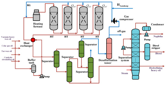 The outflow from the last HT is then transferred to a high and low pressure separation system (HLPS) in which three-phase separation of the gas, oil and water takes place. The HLPS mainly consists of four separators, as illustrated in Figure 1. The gas of the separators then enters a desulfurization tower to desorb hydrogen sulfide. After this operation, the hydrogen purity of recycled gas is improved. Meanwhile, the off-gas discharges a part of the . The hydrogen is then compressed and blended with fresh hydrogen ().The blended gas recycles back to the four reactors, in which a part of the recycled gas (RG) is mixed with feed oil, and the other gas functioned as gas quenching () quenches the beds to ensure security and protect the catalyst. And the bottom stream of the HLPS is delivered to the downstream: the fractionation process, which includes a fractionator, a diesel stripper, a condenser, and a pump. The top product of the fractionator is naphtha, the middle one is diesel, and the bottom one is tail oil.