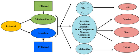 The paper is structured as follows: Section 2 describes the residue hydrogenation process in detail. Section 3 illustrates the kinetic model describing the hydrogenation process of built-in residue oil simulated in an HCR and asphaltene simulated in a PFR. Section 4 demonstrates the framework for building the whole process model, which includes characterization of the feedstock mixture, establishment of a reactor model of two parallel structure reactors, and delumping of the reactor model effluent. Section 5 presents the simulation results to clarify the model effectiveness. Section 6 provides the conclusion.